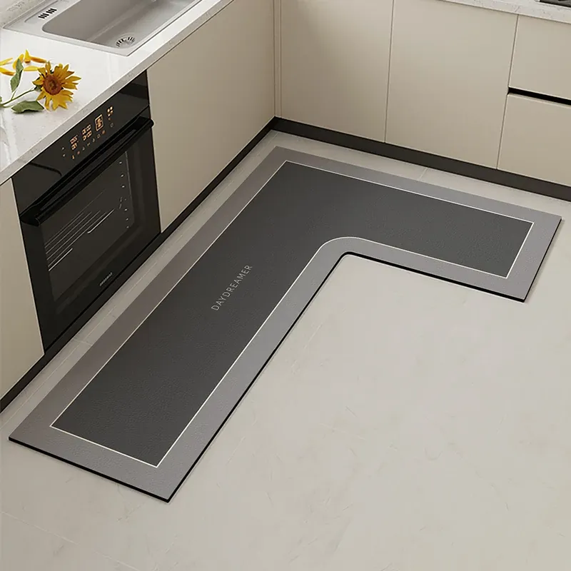 高級感あふれるキッチンマット!滑り止めレザー素材でお手入れ簡単、耐摩耗性抜群。L型で防水・防油、自由にカット可能なデザインで、あなたのキッチンをスタイリッシュに演出します。